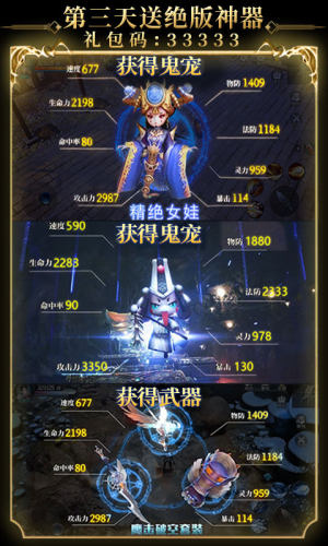 1.上线送VIP10(任务逐渐领取)还有1亿金币大礼包、限定称号大礼包、酷炫坐骑大礼包、极品鬼宠大礼包、绝版神器大礼包 五大免费礼包!!!