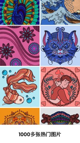 设计图样可选范围广,可以选择动物、图案、曼陀罗、著名杰作、神奇的主题以及虚幻的艺术系列来进行着色。可以放松、缓解压力,而且利用专门为孩子们打造的线条画可以帮助孩子发展创造力和提高他们的想象力!