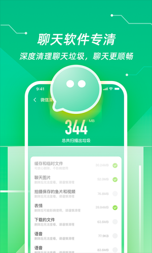 专清微信,QQ缓存,清理手机照片,视频,安装包,音乐,文档等.来帮助您更好的管理您的手机,同时节省手机存储空间。