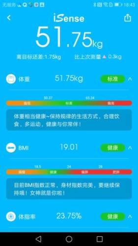 iSense应用程序可以结合iSense的智能体脂秤使用,提供了针对中国的人体成分数据模型和核心算法,几十项人体成分数据展示,包括体重,体脂率,水份率,肌肉率,骨骼肌,骨质,内脏脂肪指数,基础代谢,身体年龄等。