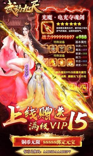 2、上线赠送满级V15,88888绑定元宝,铜币无限,一武动九天