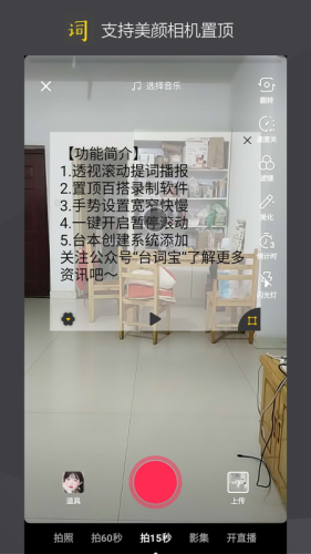 台词宝是一款可以与任何美颜相机、系统相机、短视频拍摄平台搭配使用的台本提词器
