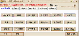 坏人YY语音专用音效特性工具是一款专门用于YY语音的音效特效软件,软件内置的音效特效非常多,适合多种场合多种类型的YY用户使用,包含了Mc喊麦专用、搞笑音效、人物音效、音乐音效、主持人专用、游戏音效非常丰富的音效效果任你选择。