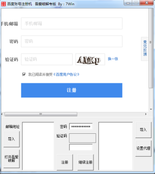 7Win百度账号批量注册机是一款支持批量注册百度帐号的工具,可以导入邮箱,设定统一密码,用户只需要输入验证码即可完成注册,使用非常简单方便,可以注册大批量帐号,用于百度贴吧、百度知道、百度空间等多个百度平台来进行推广。