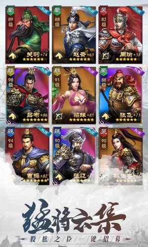 游戏以三国战役为游戏的剧情,原汁原味的展现出热血的战争画面,玩家不断地招兵买马,组建一支战无不胜的超强军队,扩展自己的领土,获取更多的资源和装备来强化自己的实力。