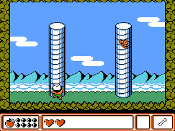 游戏技巧:在第一区域第一小关最后崖端跳起,取得隐藏宝物-蜜蜂,以后在游戏中途死掉时,标题画面一出现即按方向键任一方向和START键,便可以接关。当显示GAME OVER时,只要按十字键的上,然后按两次A,再按开始键,就可续版了。