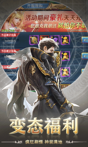 1、上线送V11,送钻石*28888,金币*500万!充值比例1:300!首充比例1:900,续充比例1:450!百种等级神秘壕礼边玩边送!