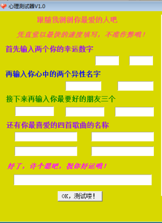 心理测试器是一款娱乐型的测试心理小工具,可以准确的推算出你最爱的人,你所喜欢的但不能与之相伴的人,你的三个朋友,你最关心的朋友,非常了解你的朋友,跟你交往很多但不一定了解你的朋友,那几首歌是描述你对人或事物的看法,你对生活,你对生活的感受,您的愿望。
