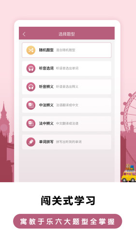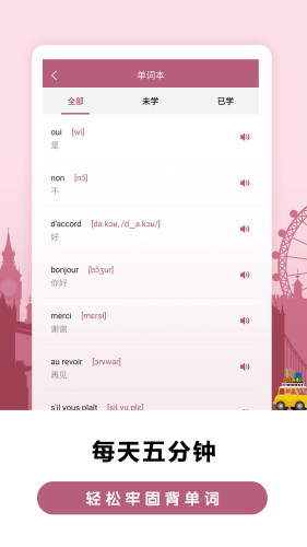 听音辨意、听音选词、听音写词、单词拼写、听音速记等专为法语学习者设计的复习方式,寓教于乐,让法语学习不再枯燥。