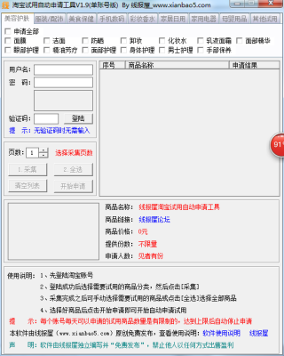 它能够帮助试客们快速自动申请淘宝试用中心内的任意产品,淘宝试用自动申请工具使用简单,可多选试用商品类别,完全自动申请无需你操心。