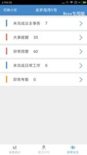 物业Boss App,用户能够随时查询物业人员的考勤数据和巡检情况,还能了解社区业主的意见和建议,处理好自己工作相关的任务。还能在线申请报修,提交个人审批,使用自动定位等功能,使物业管理人员的工作效率显著提高!