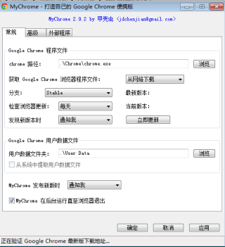 My Chrome是Google Chrome浏览器便携版自动更新升级引导器,以前的谷歌浏览器是需要google update来进行版本更新升级的,如果使用其他的绿色版、便携版等等有修改的版本就无法进行自动更新,需要用户重新下载最新版本进行安装,My Chrome不论你的Google Chrome是什么版本,都可以使用自动更新,或者不更新,或者不被强制更新。