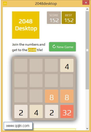 PC桌面版本的2048游戏,可离线玩游戏无须网络连接,自动保存游戏进度。2048游戏基于浏览器的HTML5技术,玩家只需要用方向键让16宫格内两两相同的数字碰撞就会诞生一个翻倍的数字。初始数字由2或者4构成,当界面全部被数字填满时,游戏就会结束。
