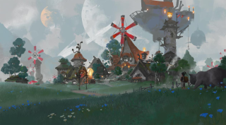 层峦耸翠的塔萨姆丘陵上,入眼除了望不到边际的葱郁,一个个矗立着的巨大风车也极为显眼。慢慢步入丘陵深处,一路上随处可见冒险家们的匆忙身影,顺着林间小路走到尽头,此行的目的地也就到了,这里坐落着一个与世无争的小镇——灵泉镇。