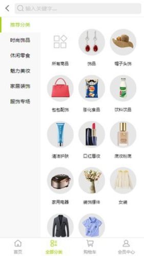 提供时尚饰品、休闲零食、魅力美妆、家居装饰、服装专场等分类,