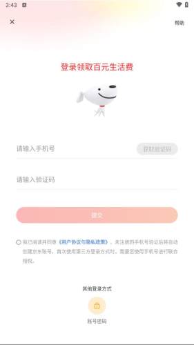 1、首先打开京东特价版软件,打开之后就会跳转到登录的页面中,只需要输入上手机号和验证码后点击【提交】即可;