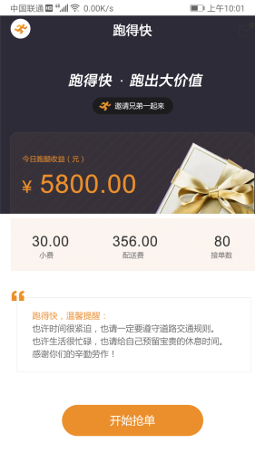 跑得真快app,外卖配送骑手端。用户可以通过平台认证注册成为骑手,智能接单,提供7*24小时代购、代买、代送、带排队等服务。
