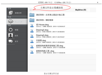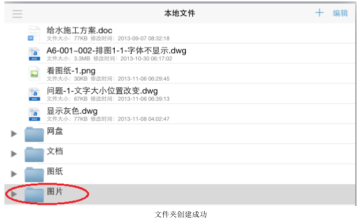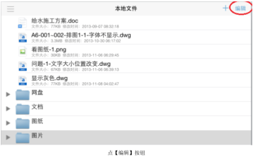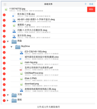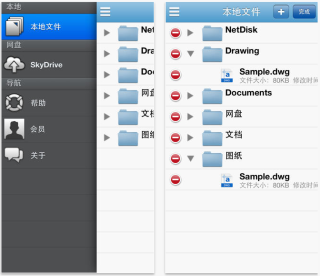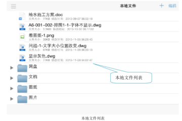 提供本地图纸文件列表,提供新建文件夹,删除文件和文件夹功能,实现本地目录和文件的管理。支持iPhone 4/4s/5/5s和iPad 2/3/4/Air