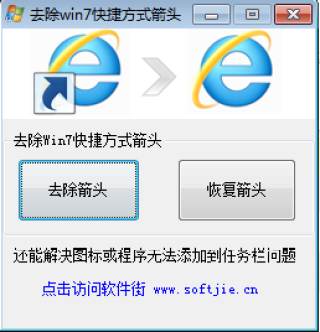 去除win7快捷方式箭头可以用来去除Windows7系统桌面快捷方式上面的小箭头,本来一些软件的图标都是挺好看的,生成桌面快捷方式之后,就会看得很不舒服,很多用户都应该有这种感觉。那这款工具就是专门用来去除快捷方式小箭头,可以一键去除箭头,简单方便,还原图标本来面貌。