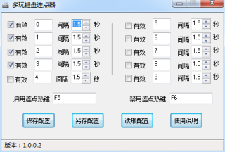 多玩键盘连点器最多可以任意设置10个连点键,你还可以给每个连点键设置不同的连点时间间隔,启动、关闭完全快捷键控制,适合玩游戏等。