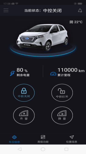 也可以通过app远程操作汽车中控,升降窗,寻找车辆等;当电动车异常时信息通知提醒