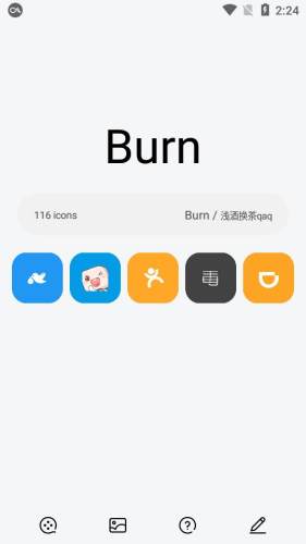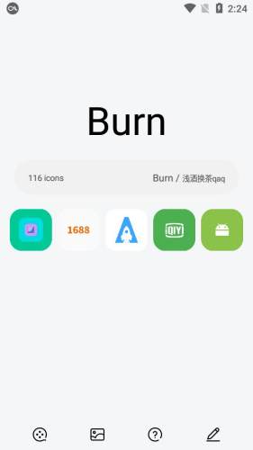 Burn图标包app,一款自定义的方形圆角图标美化工具。目前提供120个常用图标的选择替换,3个背景图自由选择,点击屏幕即可切换下一组图标包,简约好看,感兴趣的朋友点击下载吧。