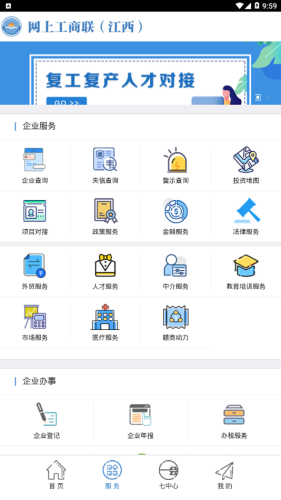 除此之外,网上工商联APP还具有企业办事服务、企业投资创业服务以及企业信息查询服务等功能。企业办事服务包括企业登记、年报、办税、科技申报、公共资源交易、赣服通等子板块。