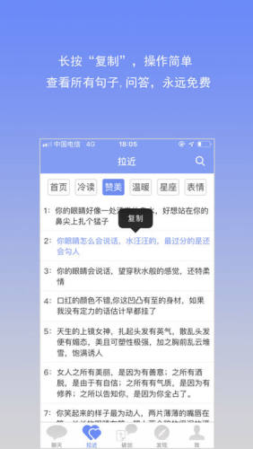 3.软件使用很简单直接,只需要把句子复制,然后粘贴到你的聊天app里面就可以了,可以让你聊的神采飞扬,幽默风趣,让女孩对你刮目相看。