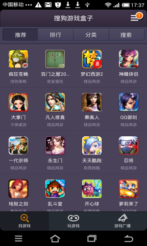 搜狗游戏盒子是搜狗游戏大厅的手机版,除了拥有海量精品、人性化游戏外,还自带游戏宝典帮助玩家快速入目,玩家还能通过手机金币兑换收费小说、游戏礼包等,跟喜欢的游戏不期而遇,精彩好玩的游戏随心挑选。