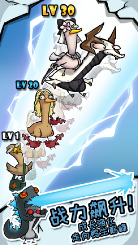 在这个神奇的世界中,你将会带领一群鸭子进行冒险。旅途上碰到的敌人也会越来越强大,需要你不断地升级鸭子们的等级,提高他们的作战力。