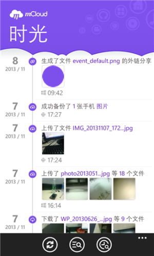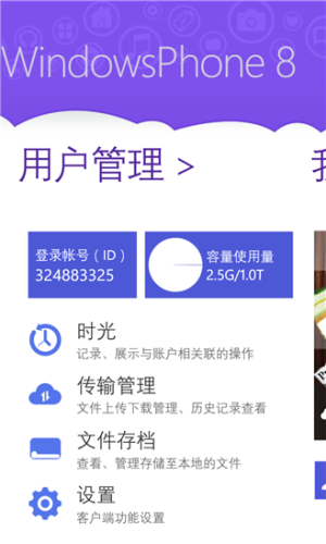 和彩云wp8客户端支持云端播放视频、音乐,并提供timeline时光功能,用手机拍下来的照片可直接上传到云端,还能提供手机通讯录备份,支持邮箱、手机号等多种方式登录。