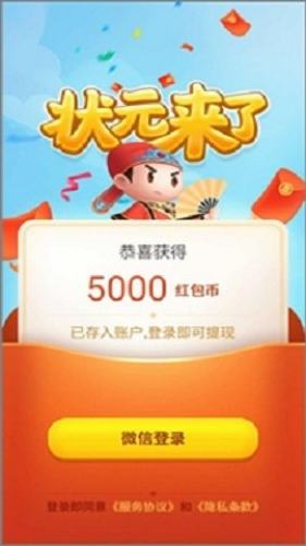 微信登陆游戏可获得5000红包币(0.50元)新人红包;