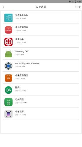 4、选择需要发送的APP,点击下一步(以app发送为例)