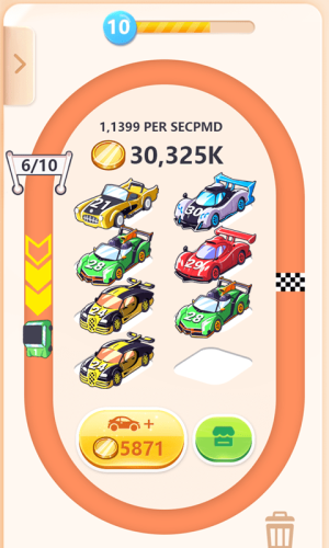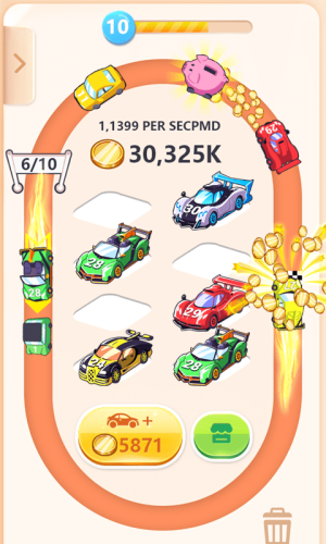 车辆可以在赛道上跑,每跑一圈可以获得等级相应的金币,等级越高获得的金币越多.通过拖拽车辆可以和相同等级的车辆进行合并,合并后车辆的等级会提升.提升车辆的等级不停的解锁新车辆。