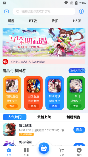 九游游戏中心下载手机版26.3M123538人在玩新一代安卓游戏下载神器《九游游戏》客户端,免费为玩家提供最全面、最新、最热门的安卓游戏和资讯;九游游戏中心同时集成了完善的游戏下载与应用管理功能,还有更方便更顺畅的浏览体验,绝对是安卓玩家们的必备下载神器!