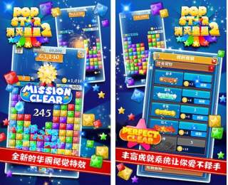 PopStar消灭星星2是一款益智消除类休闲游戏,新增道具、趣味成就、炫目道具、海量任务等全新元素将带给玩家意想不到的新鲜体验。游戏采用unity3D引擎开发,立体感十足,创新融入的雨、雪、流星、焰火等特效让你的消除休闲永不停歇,时时刺激着你的视听感官,你将在这里寻找到最纯真的快乐。