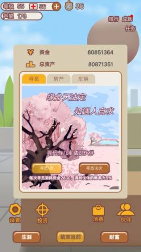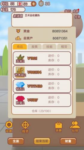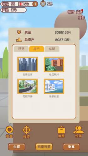造富人生是一个文字模拟玩法的手机游戏,游戏的最终目标就是成为富翁,而且是百万富翁,千万富翁,你将一口气拿出自己所有家底来投资创业,用努力去赌自己的生涯,不管怎样,就是要不断地赚钱。