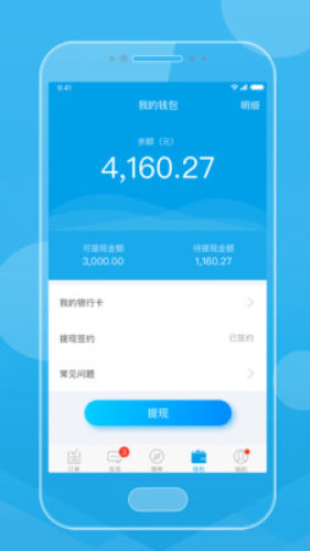 钱包:订单任务完成三天后即可得到服务收入,一周后随时申请提现,平台保障,安全方便;