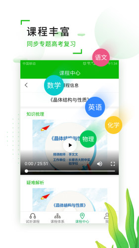 汇集全国省市级优秀名师,精心研磨课程体系,建设适合高中学生学习的同步复习类、专题提升类、模拟试题精讲类等高端精品课程,帮助学生强化巩固知识、及时查缺补漏、理清知识脉络、培养创新思维。