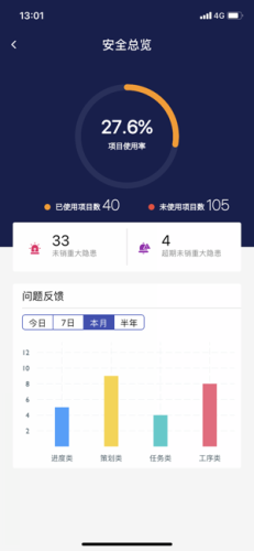 【安全总览】展示各组织下的安全检查执行情况,包含安全检查过程中的合格率、整改率、隐患数量等指标、查看现场人员反馈的问题等