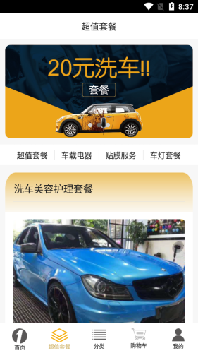 洗车、车载电器、贴膜服务、车灯套餐商城等。