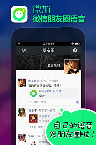 有了微加就能在微信朋友圈发语音啦,独特的微加小浮窗悬浮在你的微信上方,拥有海量的聊天表情和语音段子,是男生卖萌、女生装可爱的必备神器,好玩又有趣,丰富你的微信生活。