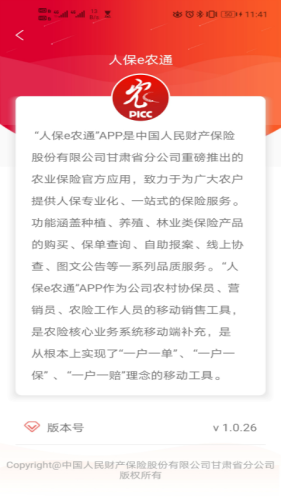 “人保e农通”APP是中国人民财产保险股份有限公司甘肃省分公司重磅推出的农业保险官方应用,致力于为广大农户提供人保专业化、一站式的保险服务。功能涵盖种植、养殖、林业类保险产品的购买、保单查询、自助报案、线上协查、图文公告等一系列品质服务。