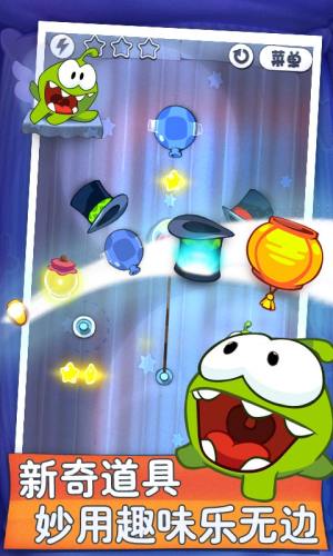 游戏操作便捷,你只需滑动手指,剪断绳索,并在各色新奇道具的帮助下,想方设法使绑着的糖果掉入小吃货Om Nom的嘴里,即可圆满它甜蜜的糖果梦。不过,游戏上手容易精通难,计划好让糖果掉落的过程中满星过关就需要费一番心思了,欢迎个年龄、性别的玩家们挑战。