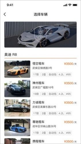 用户通过我们的APP,可以浏览心仪的豪车车型,确定车型之后在线预定,输入预约时间及取车地点即可生成订单。