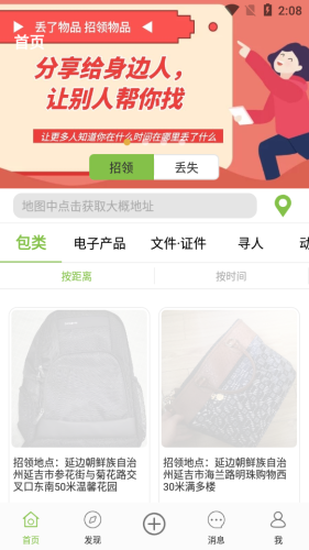 在首页列表中可以按距离,时间等不同的方式查找您身边的丢失以及招领信息。希望能为广大群众带去更多的生活便利。