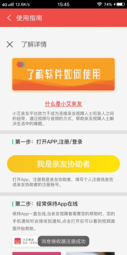 小艾亲友是一个致力于连接视障人士及其亲友/专业志愿者的软件。可以配合小艾智能眼镜,让远程专业人士或者亲友为视障者提供长时间的生活上的视频协助。