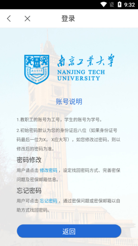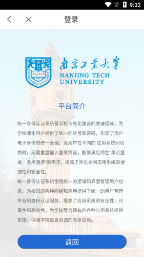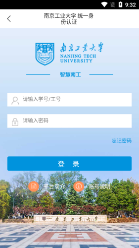 i南工app,南京工业大学校园服务系统。用户输入学号、工号、密码后,通过身份认证,即可享受办公教学、科研生活等便捷服务,让在线师生体验智慧校园生活。