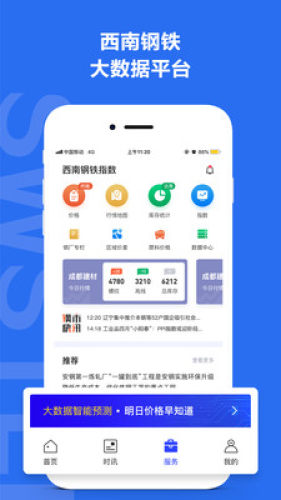 西南钢铁指数,专为四川的西南地区打造的钢铁数据服务助手。用户登陆后即可查看钢铁市场价格及库存情况,支持免费使用大数据行情预判系统,帮助预测价格行情,提供有价值的信息数据。