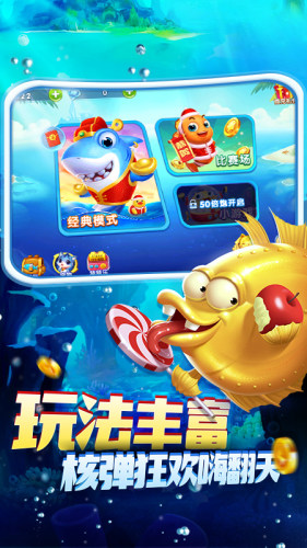 1、多样技能,多种炮台,丰富玩法,快速上分下分,奖金鱼,章鱼BOSS,食人鱼BOSS,切水果,消消乐,连连看,贪吃蛇,多种休闲社交玩法满足同屏爆金体验。